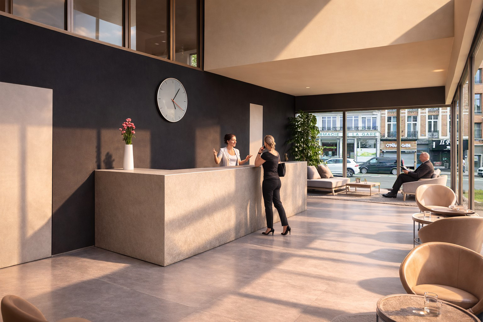 La volumétrie exprime la dualité du programme. Les bureaux se caractérisent par de grandes façades vitrées toute hauteur, affirmant leur relation avec la ville et maximisant l’apport de lumière naturelle. Les logements adoptent une écriture plus domestique, rythmée par les ouvertures et les balcons, permettant d’inscrire le bâtiment dans la continuité du tissu urbain.