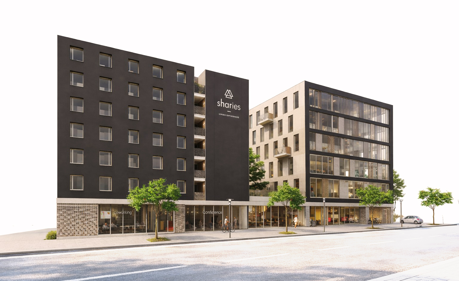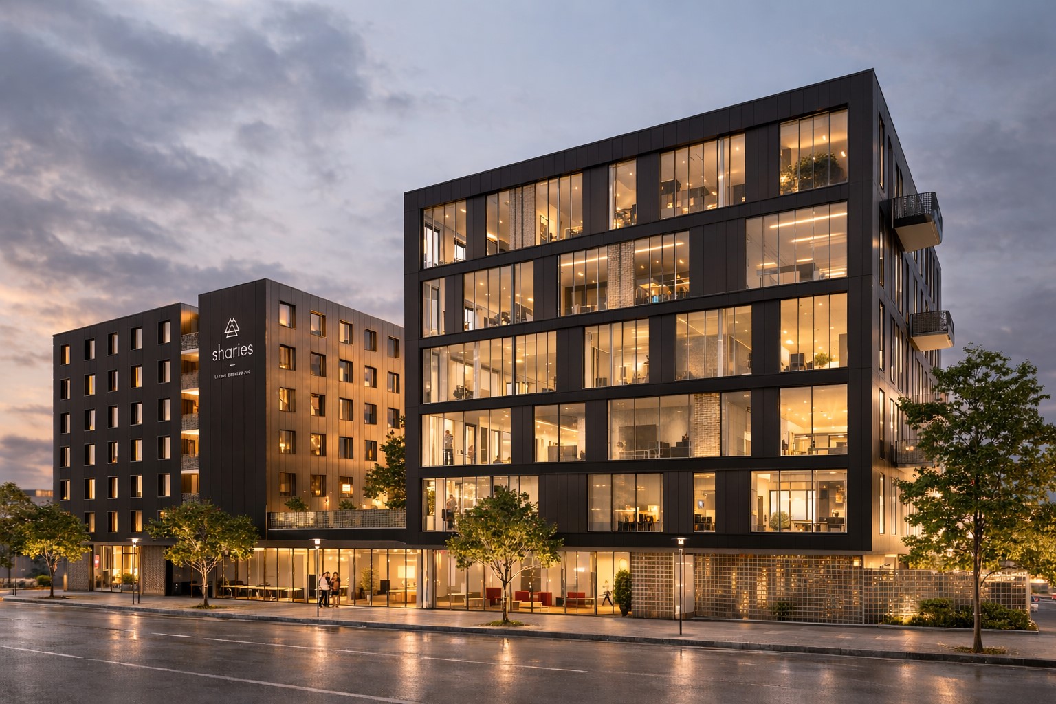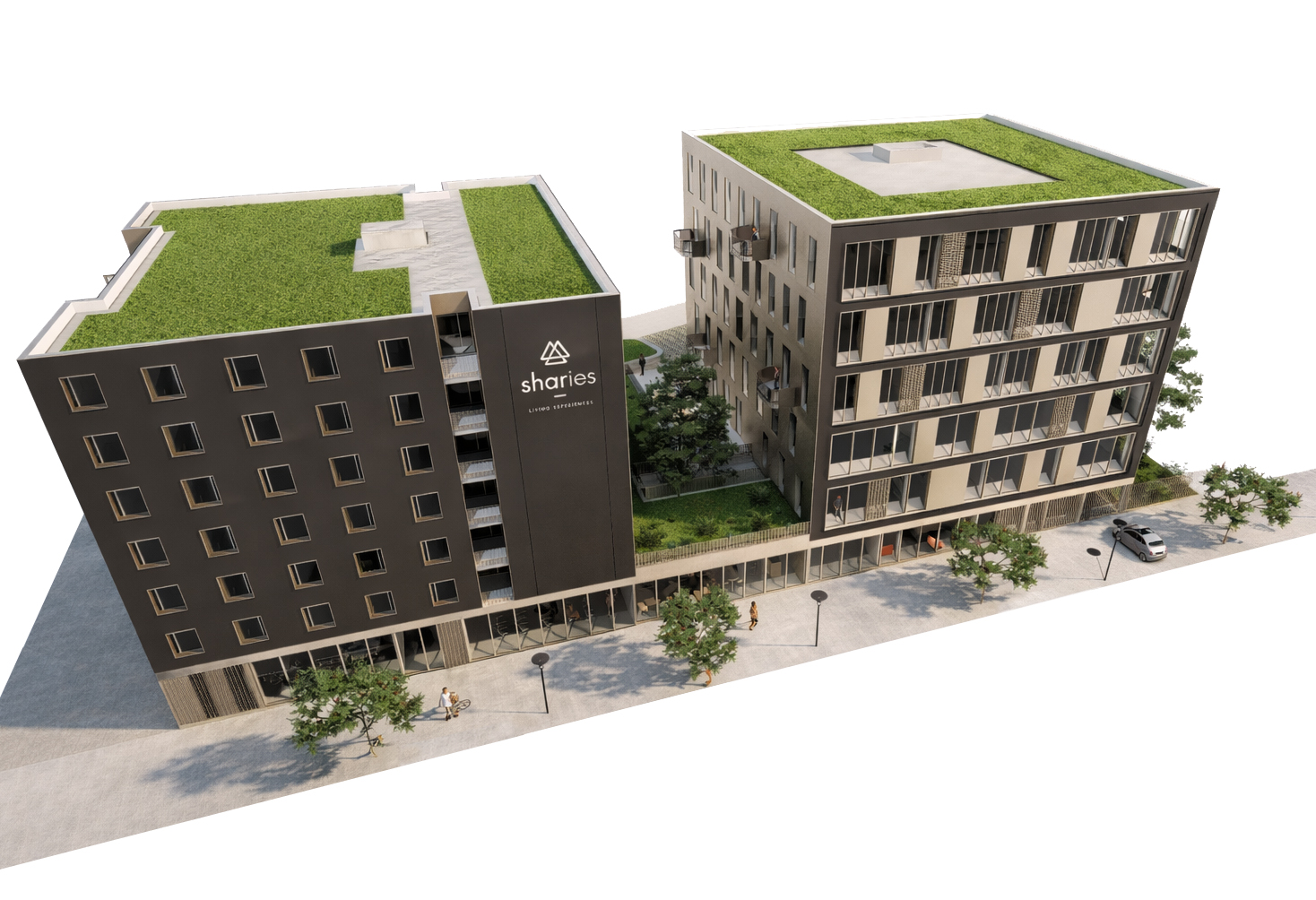 Au nord, une résidence de co-living développée sur six niveaux accueille des logements du T1 bis au T6 organisés autour d’espaces partagés. Au sud, un immeuble tertiaire de cinq étages propose des plateaux de bureaux flexibles. Ensemble, ils composent un programme mixte de 6 500 m², associant habitat, travail et lieux de rencontre.