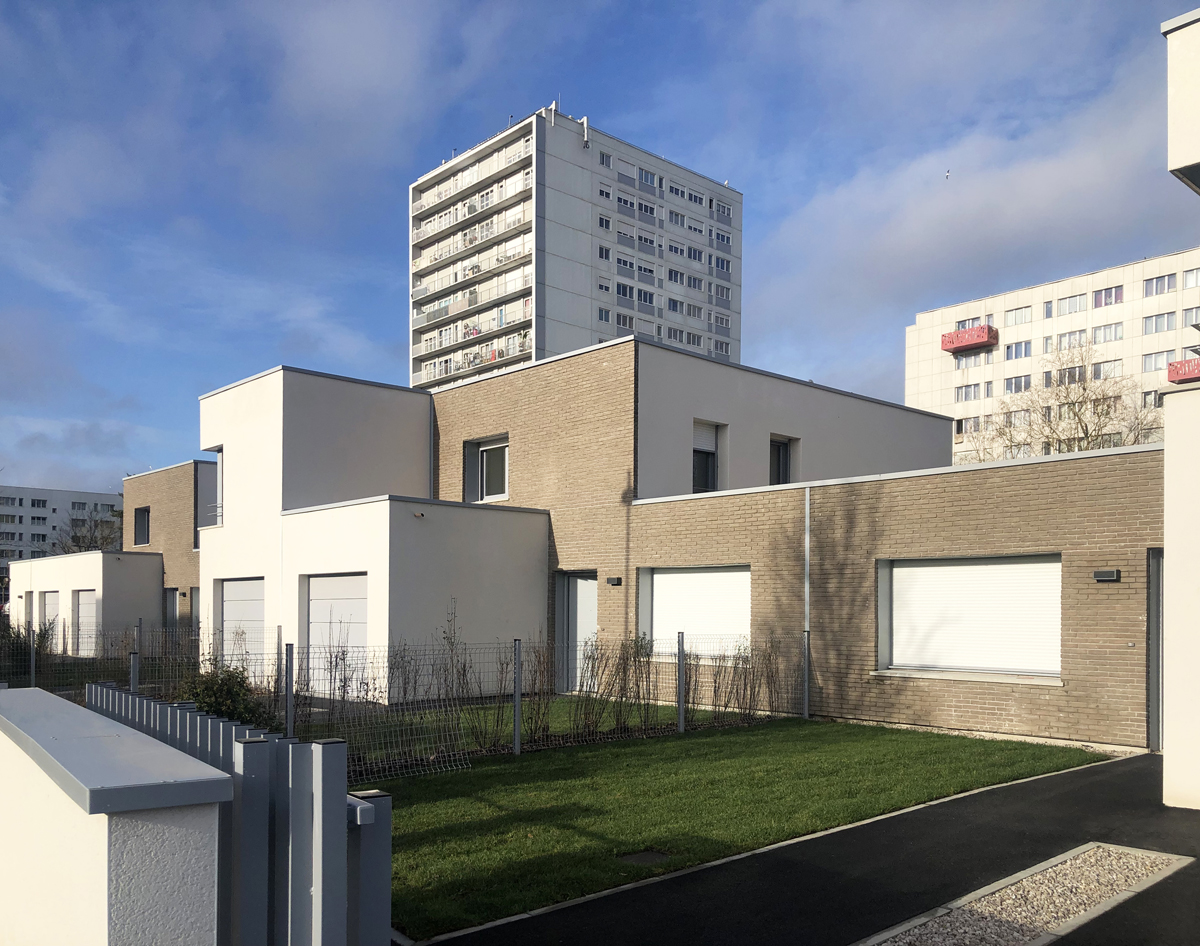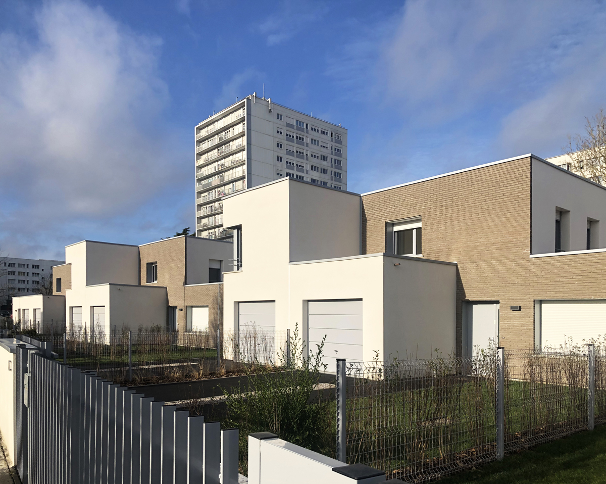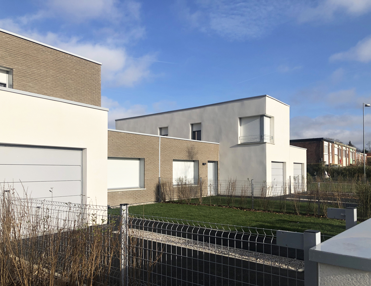 Conformément au cahier des charges mis à jour, les logements individuels prennent place de part et d’autre d’une voie nouvelle chargée de relier les rues du Languedoc et d’Ile de France, un immeuble de 10 logements collectif marquant l’angle sud ouest de la parcelle ; ce dernier constitue, à l’échelle de notre projet, une transition entre les maisons qui reprennent le gabarit des rues qui mènent au Fort de Mons et les immeubles hauts qui amorcent le quartier de la mairie.