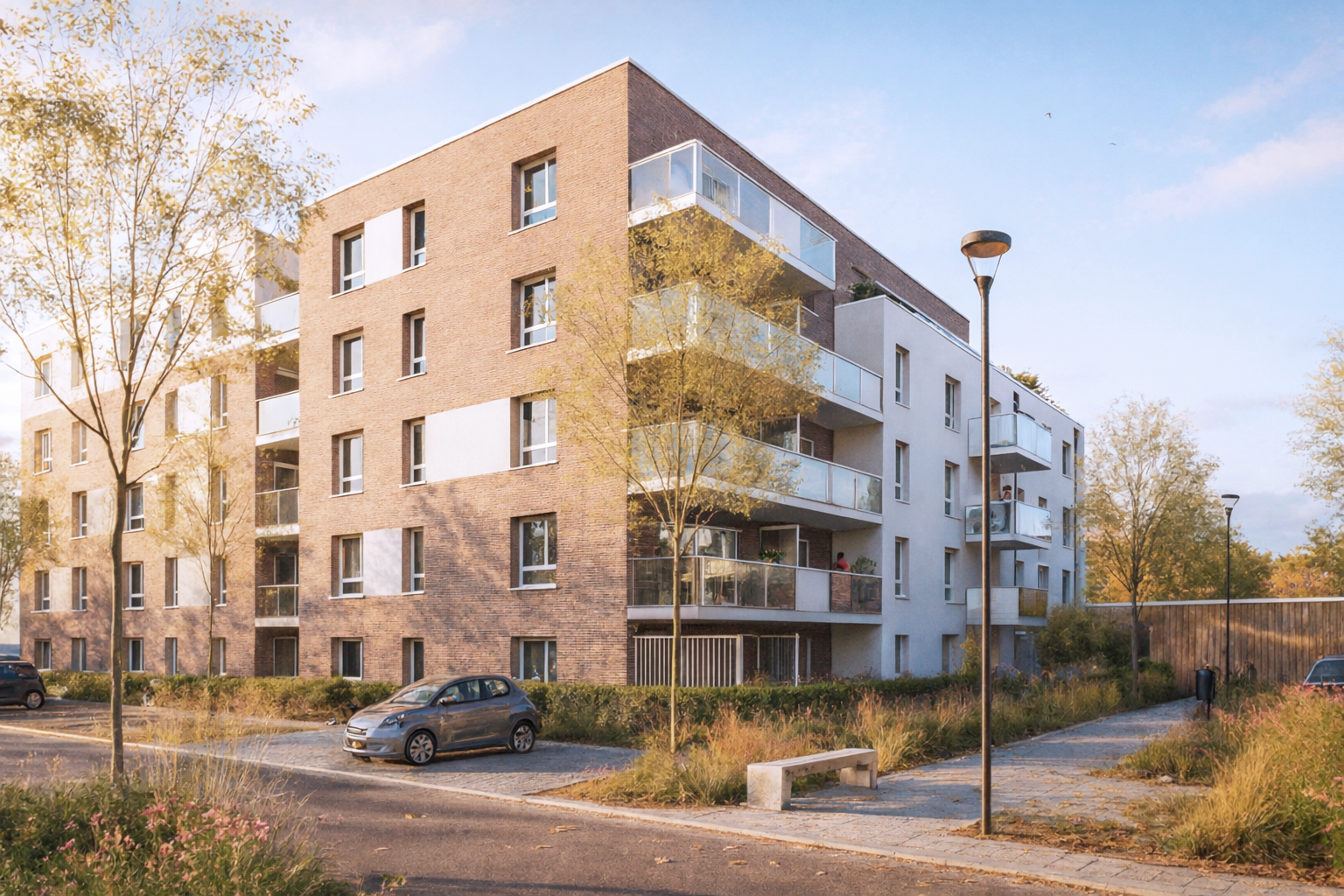 L’architecture propose un volume en R+3 surmonté d’un attique, avec une écriture sobre et contemporaine. Les façades principales sont habillées de briques rouge-brun, en référence au tissu local, tandis que des enduits clairs viennent souligner certaines parties du bâtiment. Les éléments métalliques laqués blancs et les garde-corps vitrés apportent légèreté et finesse à l’ensemble.
