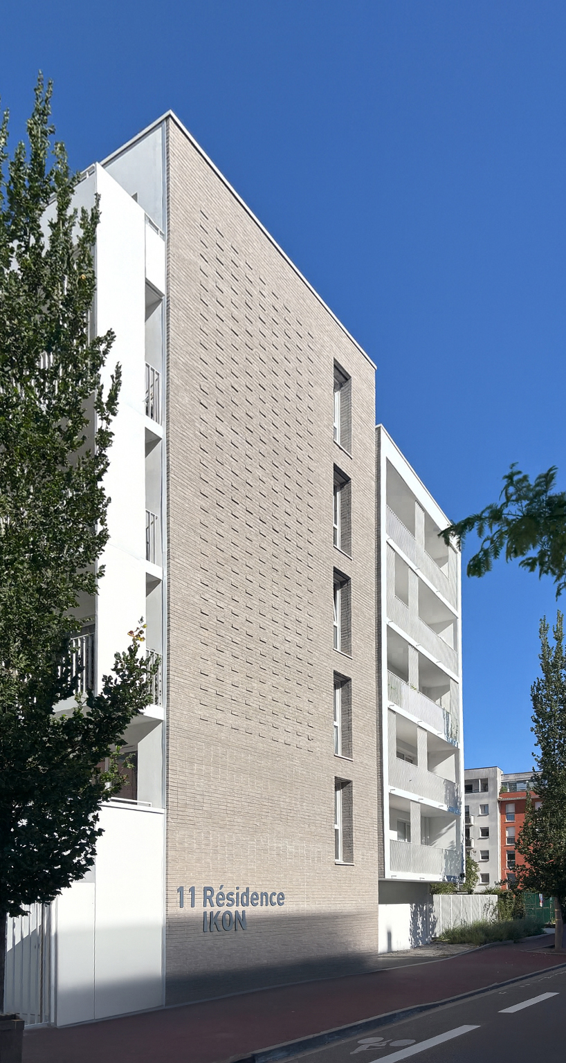 Un socle principalement en briques dissimule un rez-de-chaussée mutualisé qui abrite le stationnement couvert et les locaux communs, tandis que quelques stationnements sont réalisés à ciel ouvert en fond de parcelle. Le socle, rythmé d’ouvertures, permet l’identification rapide des accès piétons et véhicules. La signalétique de la Résidence "IKON" associée au hall vitré permettra l’identification rapide de l’accès principal au bâtiment, tandis que le traitement du rez-de-chaussée