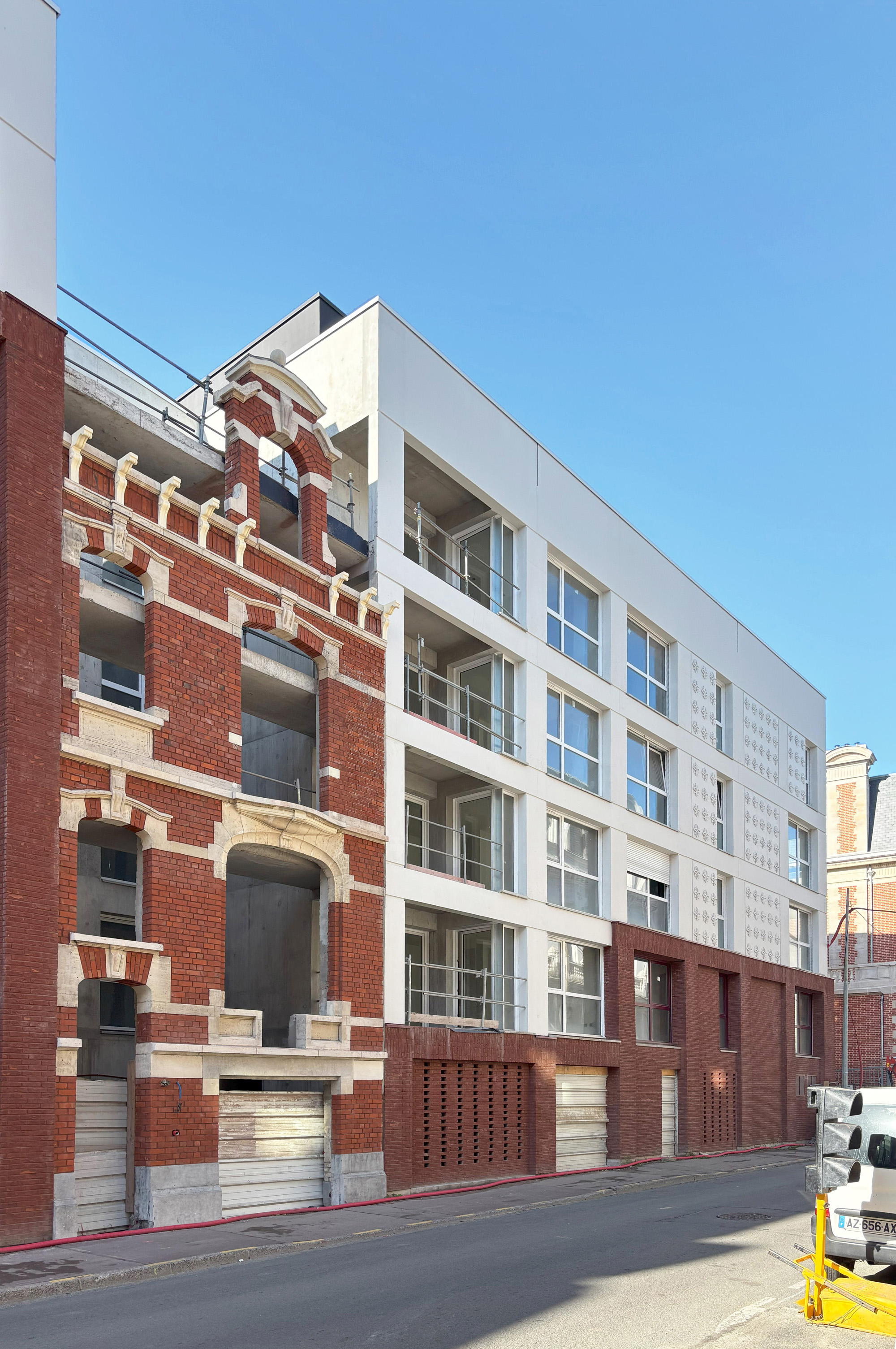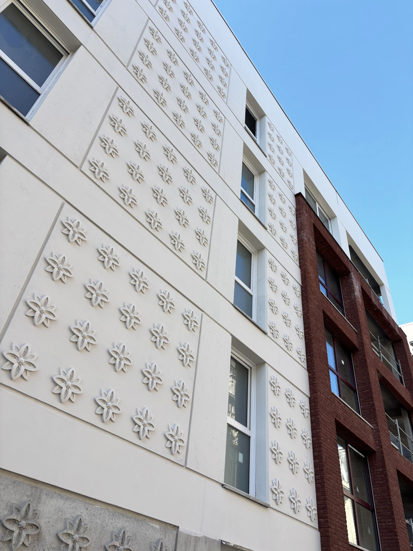 la modénature des hôtels particuliers qui ponctuent la rue de Lille. Celle-ci a été réalisé sur site par l’entreprise de gros œuvre GCC. Le béton lasuré de teinte claire renvoie à l’aspect de la pierre. Les façades alternent briques rouges et béton lasuré.