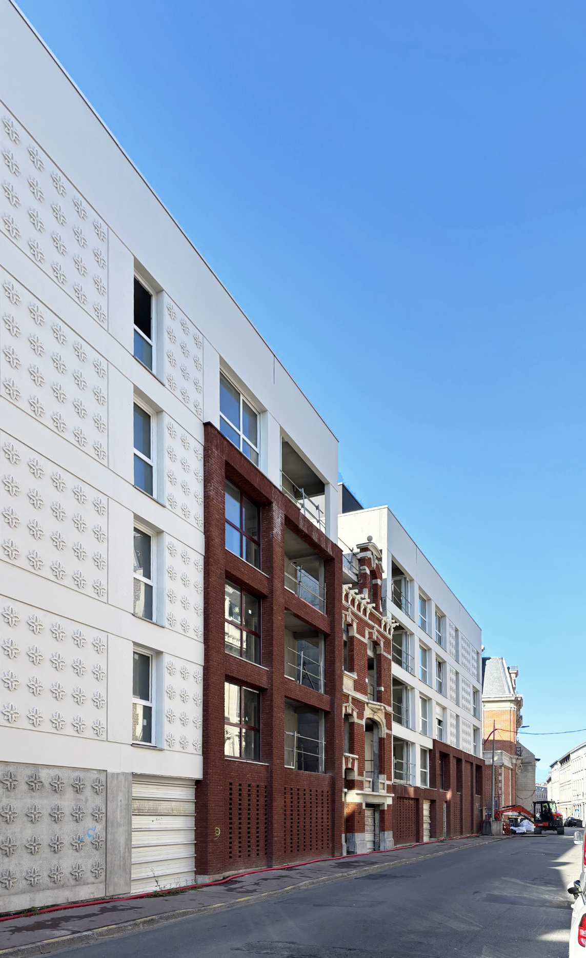 Après démolition des habitations vétustes qui rythmaient la rue de Lille entre le 53 et le 65, le front à rue est reconstitué tandis que des plots se développent en second plan. Une façade remarquable a été conservée et intégrée au projet suivant les recommandations de l’architecte des bâtiments de France, en charge du secteur, Etienne Dubois. Elle sert d’entrée à l’opération et constitue la référence chromatique qui a servi au projet. La rosace dessinée par l’agence D’Houndt + Bajart est inspirée de